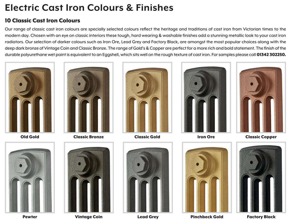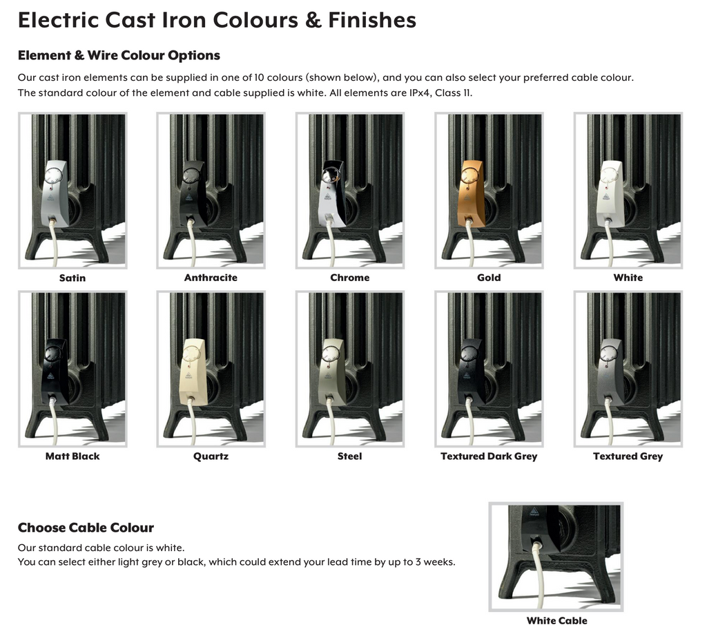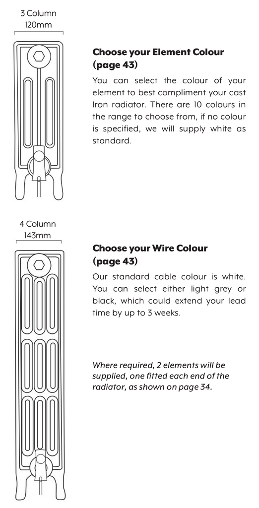 Choose your Element Colour - You can select the colour of your element to best compliment your cast iron radiator. There are 10 colours in the range to choose from, if no colour is specified, we will supply white as standard.