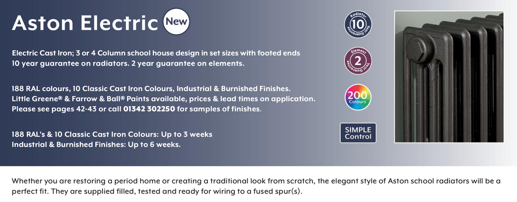 We are not just an online retailer - we have a 150+ designer radiator showroom in the heart of Leeds.Buy with confidence as we are an approved supplier - the The Radiator Company Aston (3 Column) Cast Iron Radiator Electric comes with a 10 year manufacturers guarantee.
