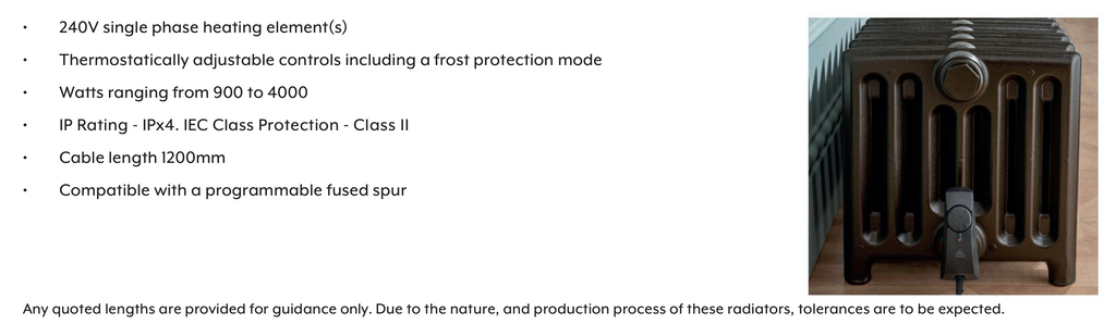 Our Ledbury Electric cast iron radiators are fitted with a 240V single phase heating element which has thermostatically adjustable settings including a frost protection mode. They are supplied filled, tested and ready for wiring to a fused spur.