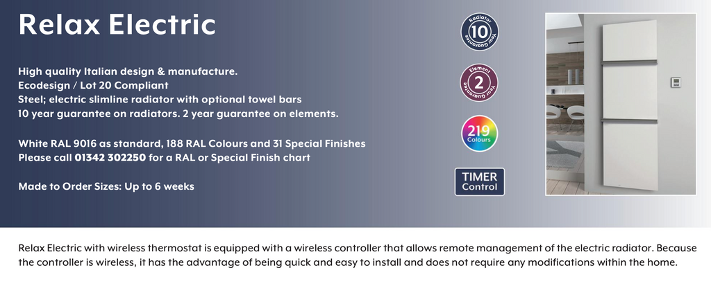 This stylish bathroom version has all benefits of our Relax radiator, wireless remote control, over 200 colours and finishes, EcoDesign and Lot 20 compliant, plus two chrome towel bars with flexible fitting locations.