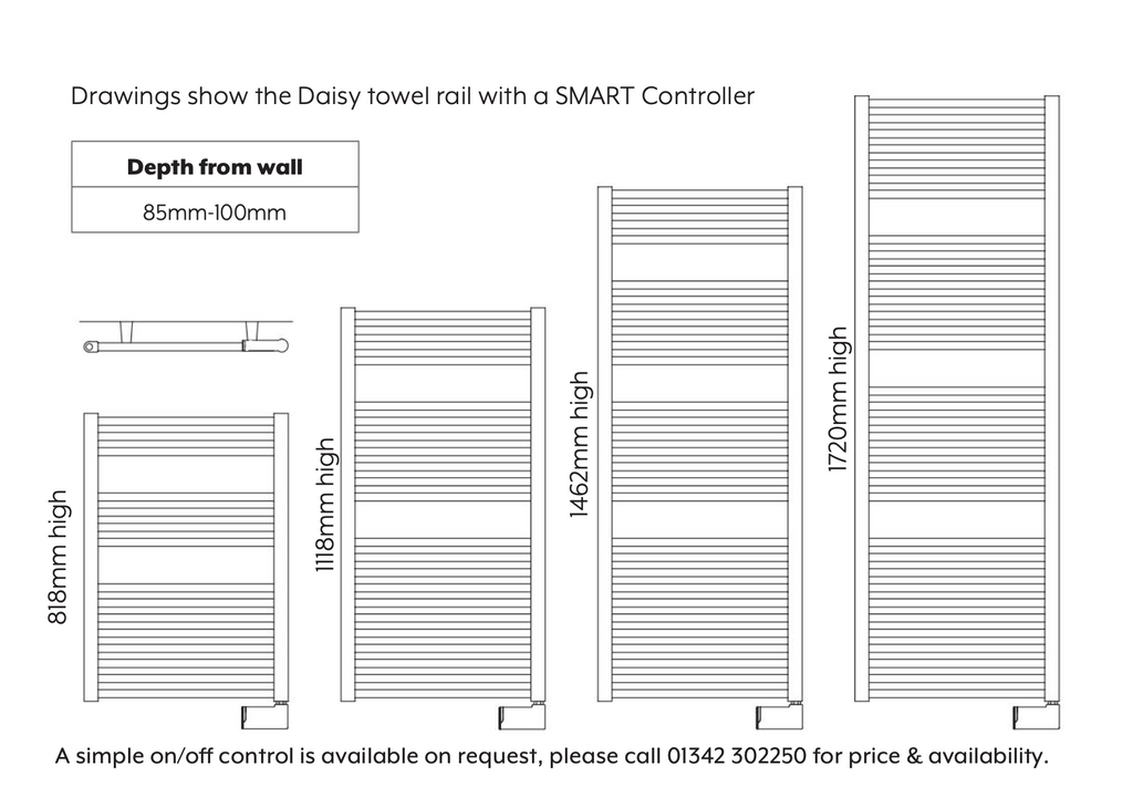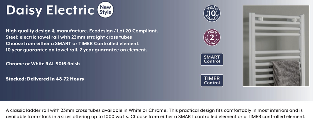 The Radiator Company Daisy ElectricTowel Rail - A classic chrome towel rail with 23mm cross tubes and D-shaped collectors. This practical design fits comfortably in most interiors and is available from stock in 5 sizes offering up to 1000 watts. Choose from either a SMART controlled element or a TIMER controlled element.