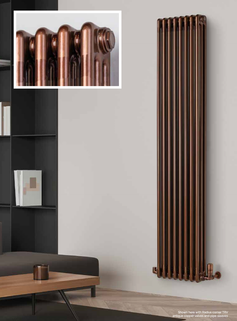 The classy Multisec Raw multi column radiator offers a contemporary industrial look with its polished and machined metal finish set beneath a deep copper or brass lacquer. This radiator is available in any size chosen from the Multisec range and is made from the same 25mm diameter, 1.2mm steel with 1.5mm headers. Each radiator is supplied with wall brackets, plug and air vent. Capable of operating up to 8 bar (tested to 10 bar), each Multisec Raw radiator has ½”bsp-f connections (standard connection detail 08 = BBOE).