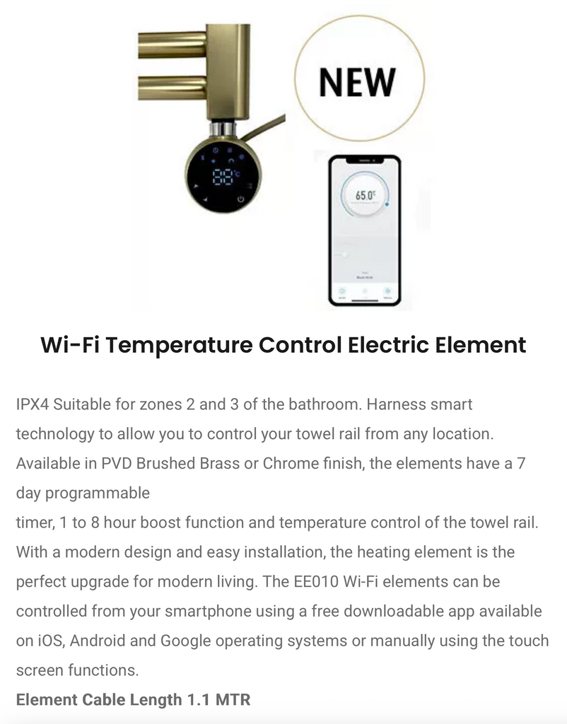 timer, 1 to 8 hour boost function and temperature control of the towel rail. With a modern design and easy installation, the heating element is the perfect upgrade for modern living. The EE010 Wi-Fi elements can be controlled from your smartphone using a free downloadable app available on iOS, Android and Google operating systems or manually using the touch screen functions.