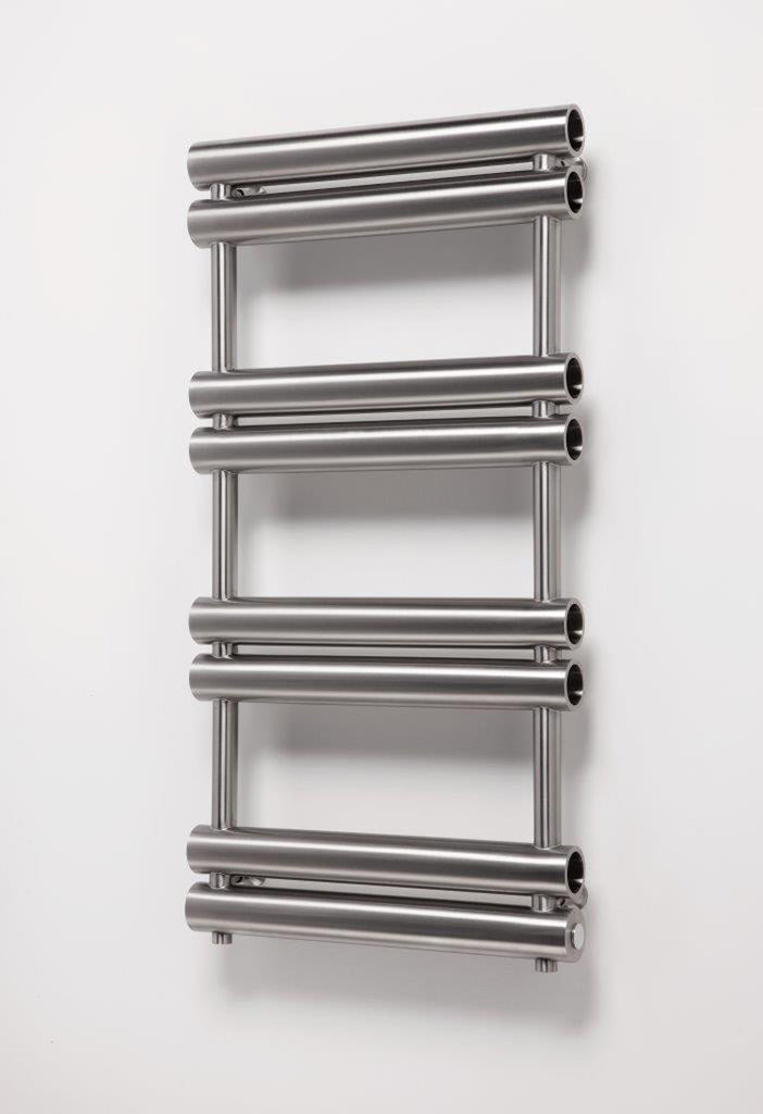 Tubo is made up of a range of horizontal, chunky tubular rails. These 500mm sections feature a tube-in-tube design, which allows the radiator to run on less water, just 3.57 litres, allowing it to reach maximum heat output quickly and more efficiently.